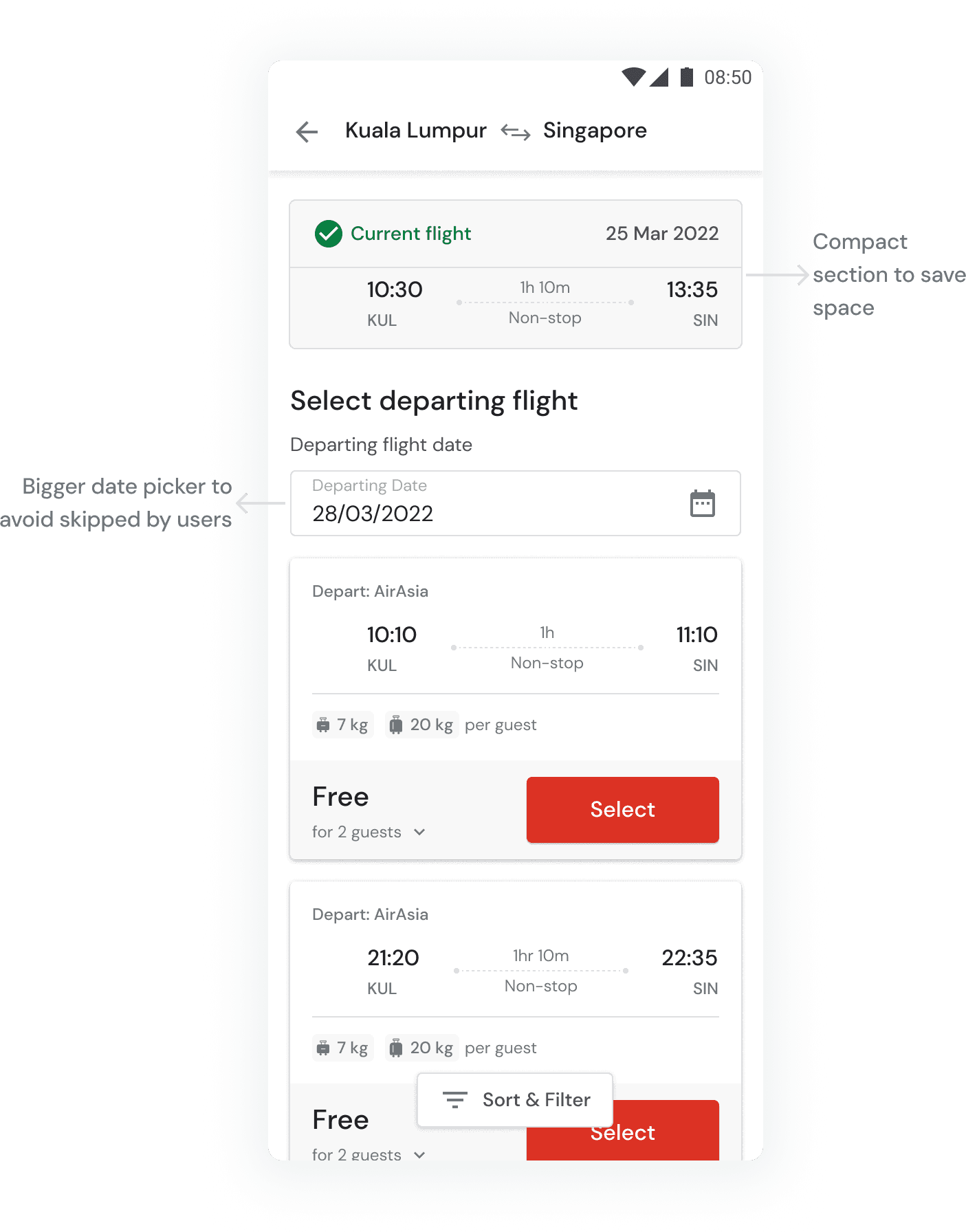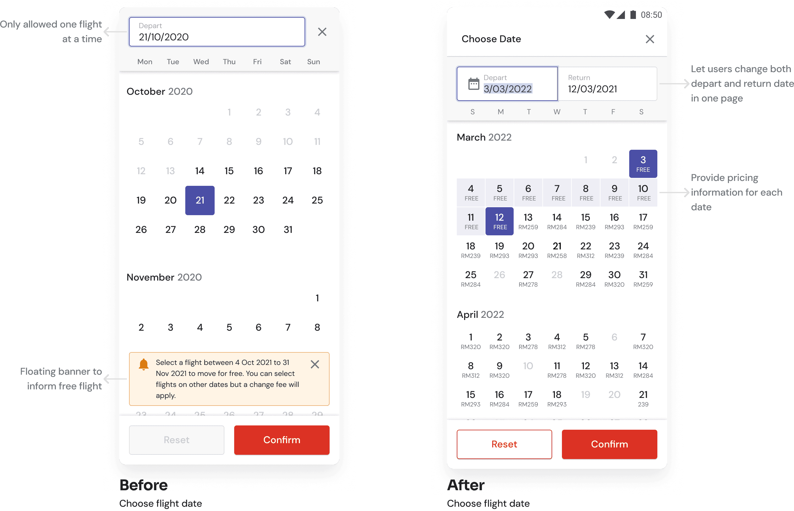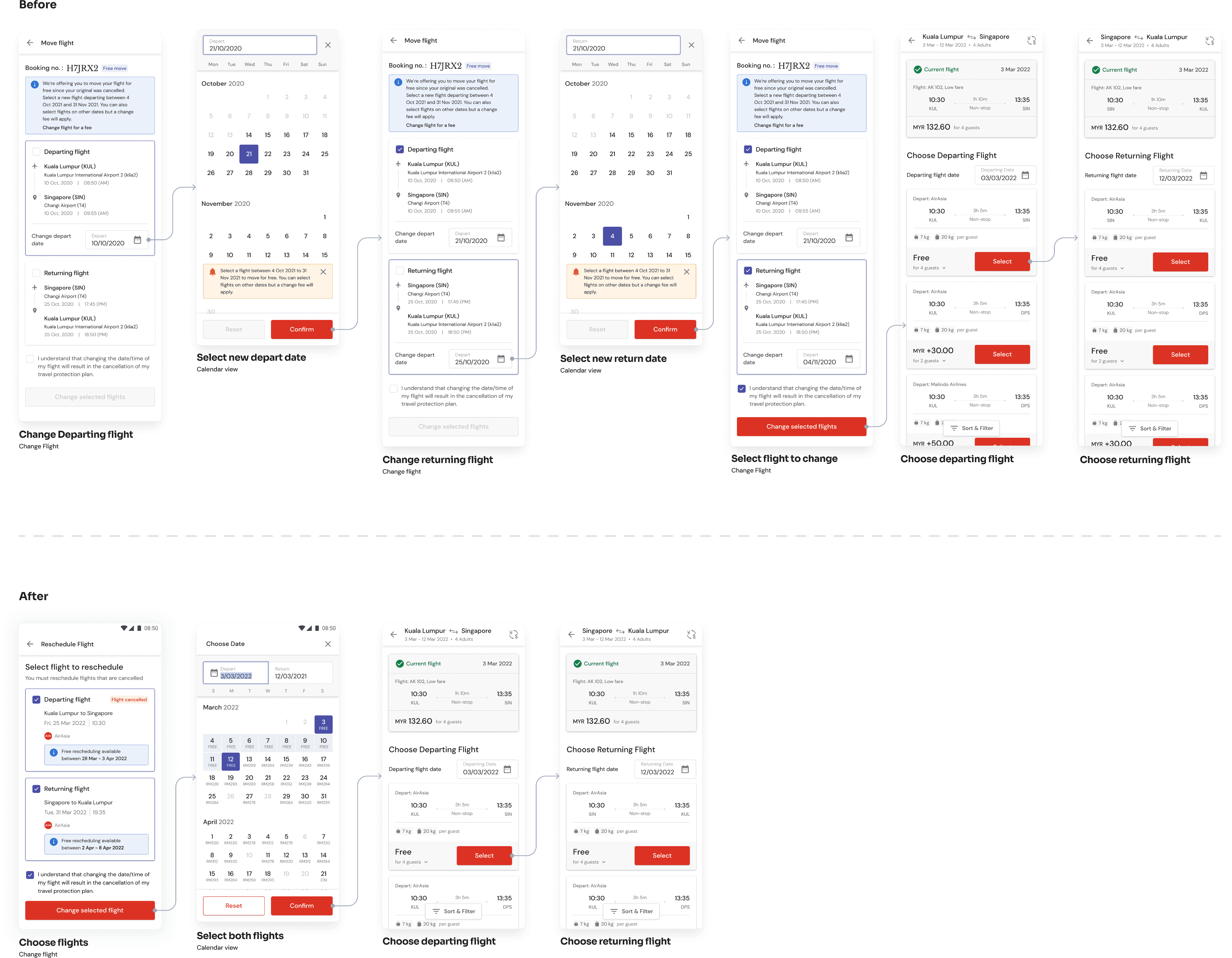 The previous design requires users to go back and forth if they want to change both of their flights. Not to mention that the page was ambiguous since it provided two entry point to change the flight date.