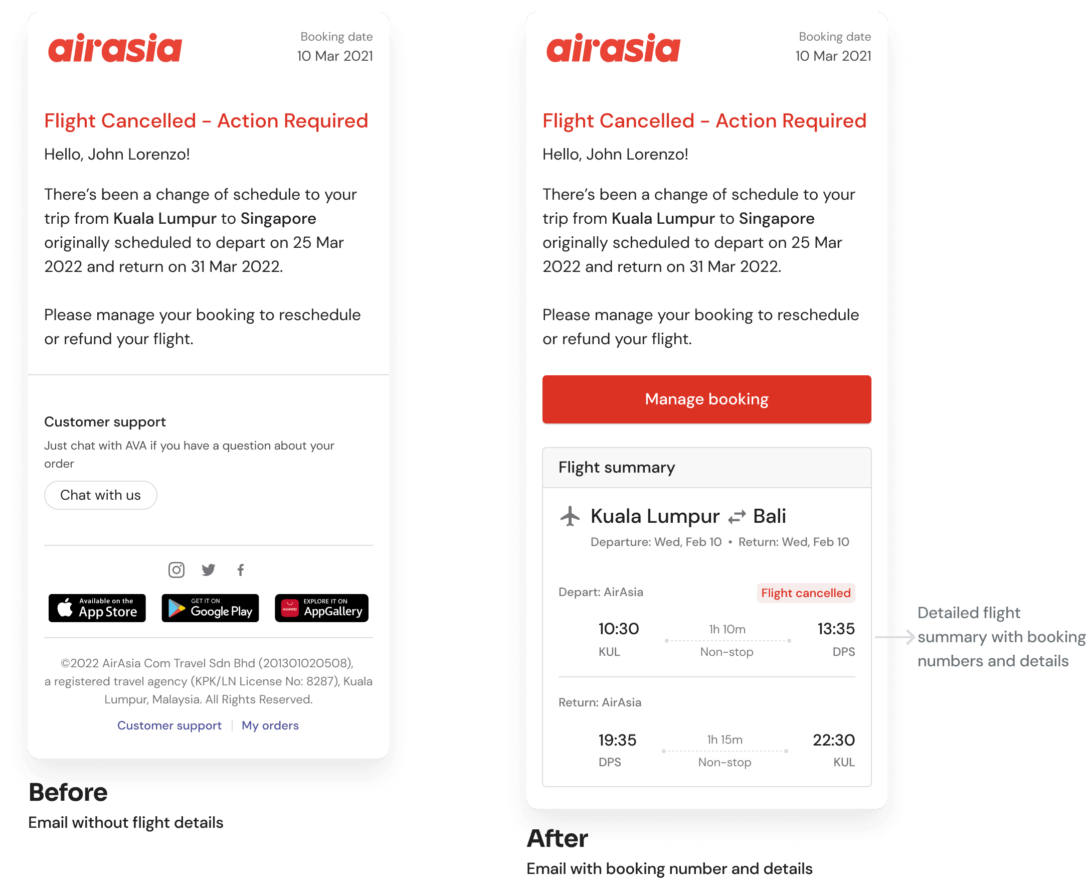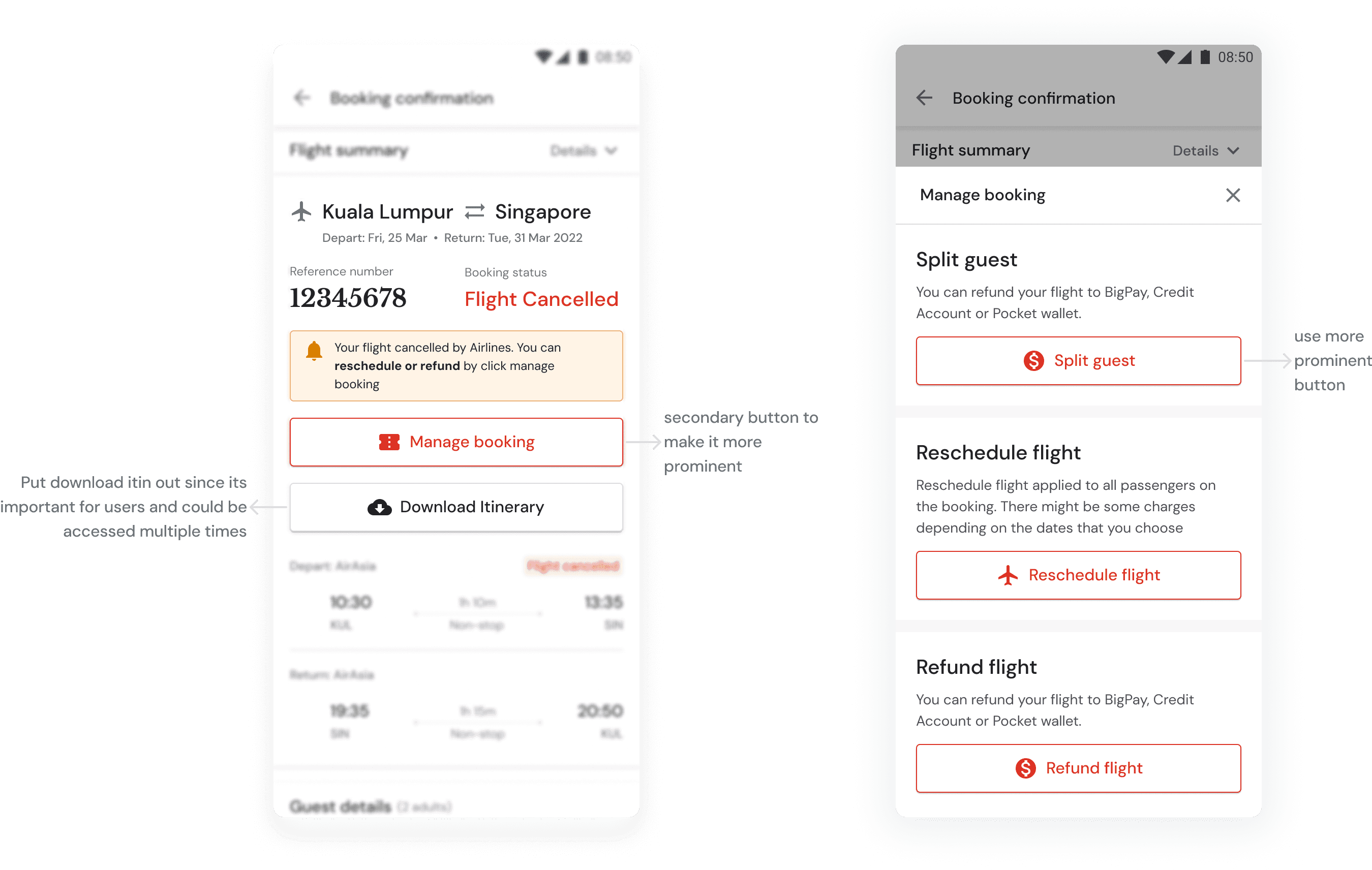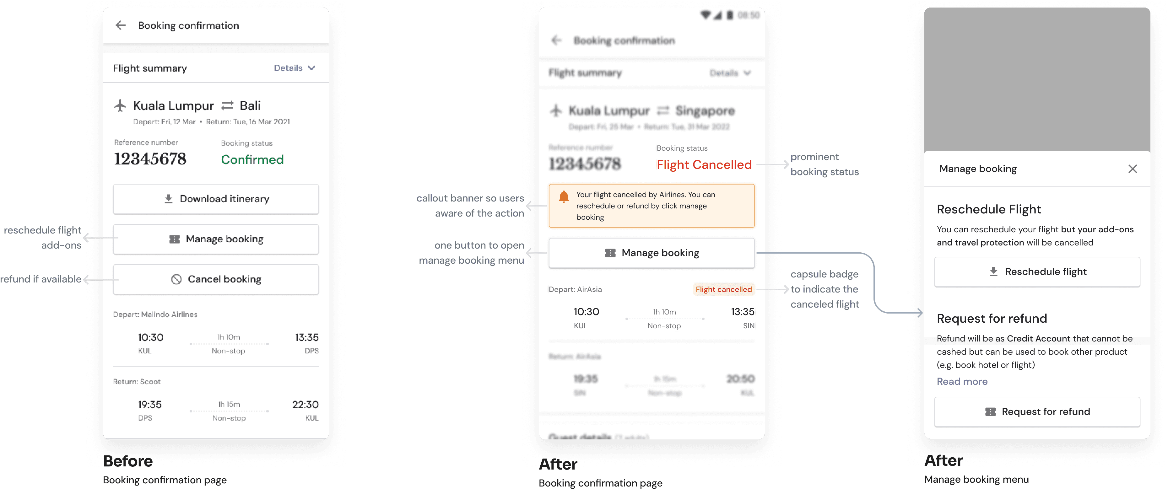 The problem we discovered were first, users only know their flights got canceled but not clear which flights got canceled. By knowing which flights canceled they can make decisions whether to cancel the canceled flight only or reschedule both flights or even refund the whole booking.