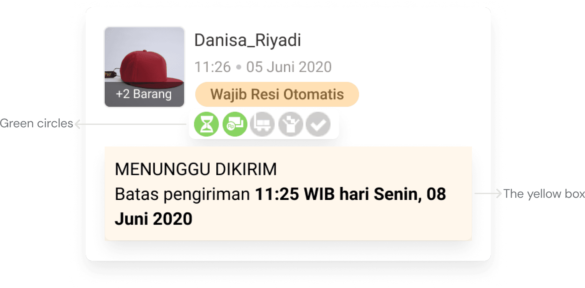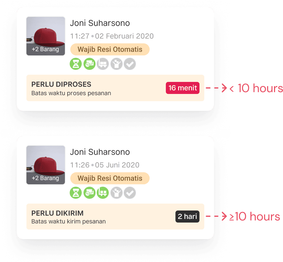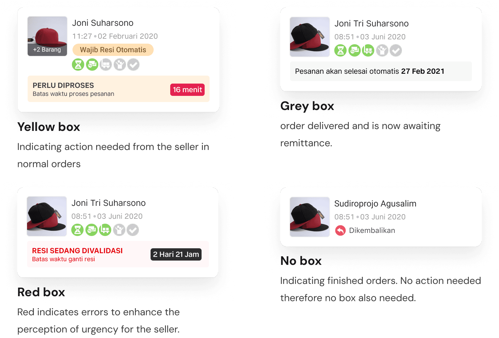 Additionally, I kept the green circles and optimized the yellow box because sellers utilize that to determine their actions toward the orders. I added variations on the “yellow box” or status box to differentiate the cards based on its status
