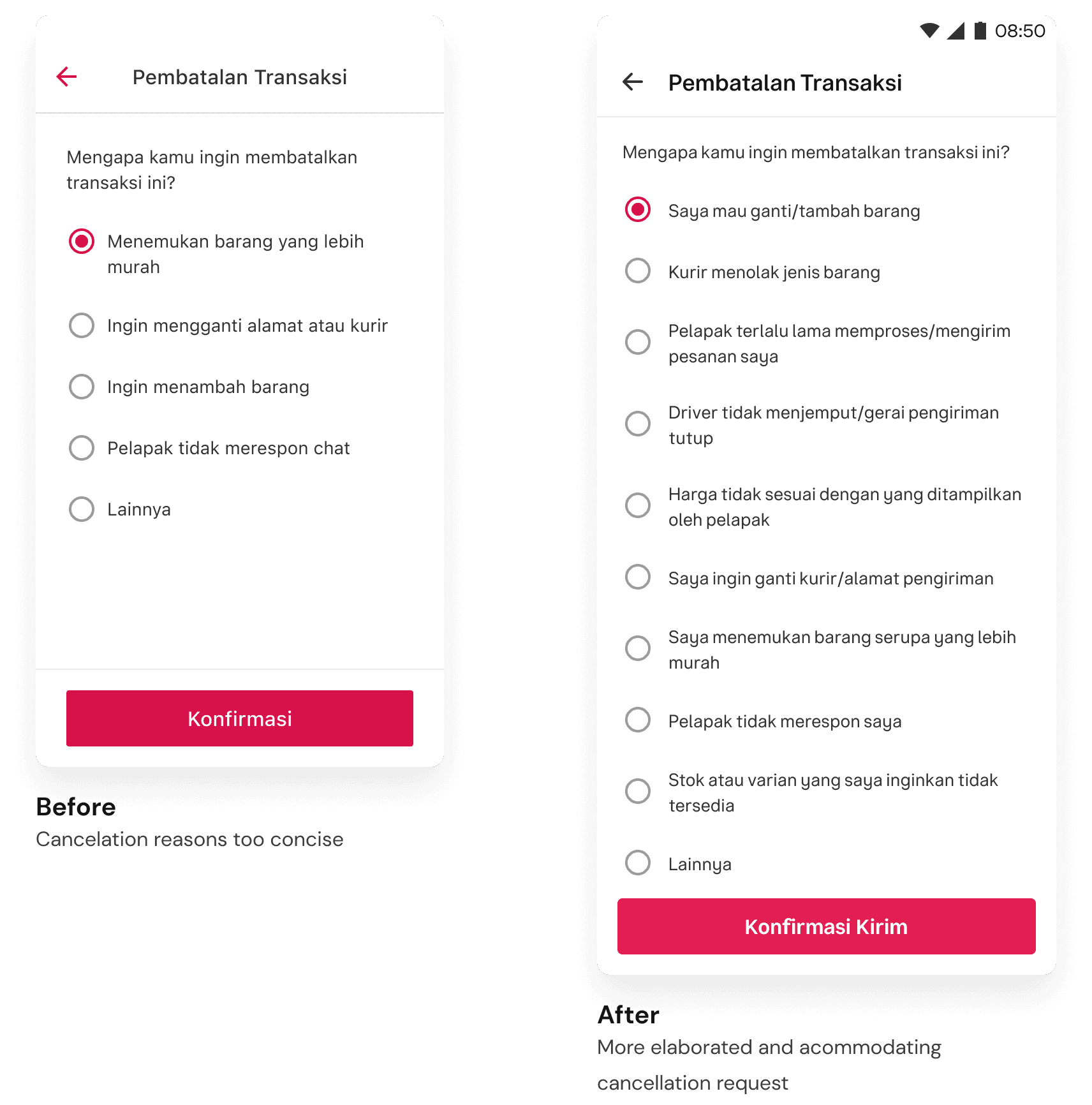 A supplementary solution was the elaborated cancellation reasons to accommodate users, since the previous ones didn’t capture the actual reasons behind their decision to cancel transactions.