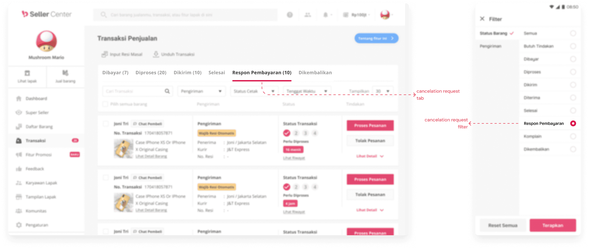 The goal was to make sellers aware of the cancellation requests. An additional tab was added to consolidate all cancellation requests from buyers on one page and filter on apps so sellers on Seller Center know at a glance if they have cancellation requests to respond to.